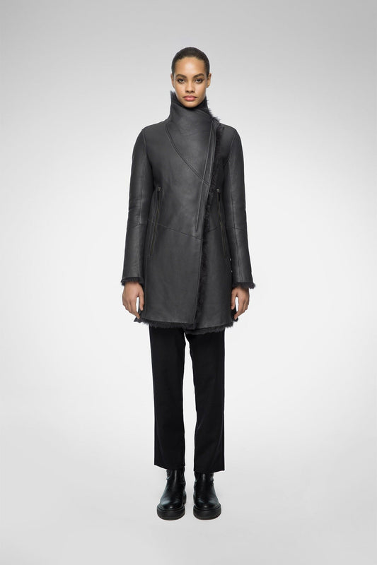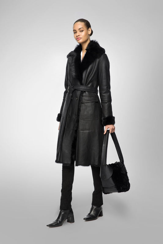 Women's Shearling Fur Leather Coat In Black