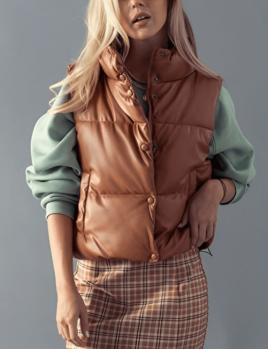 Women's Puffer Leather Vest In Tan Brown