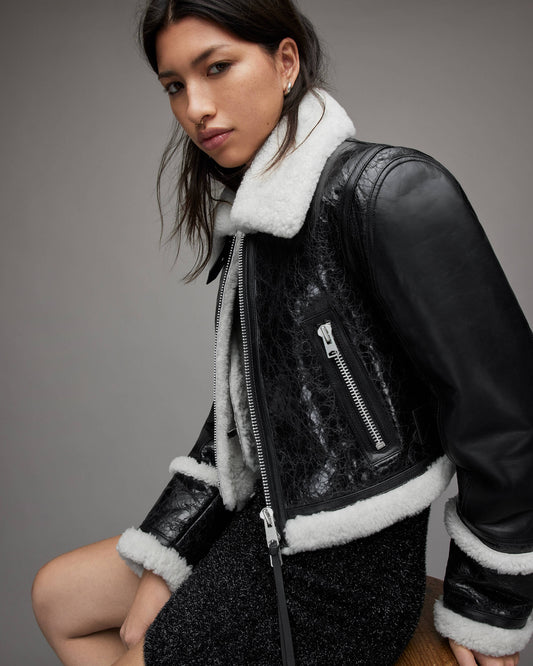 Women's Shearling Leather Jacket In Black With Crackle Texture