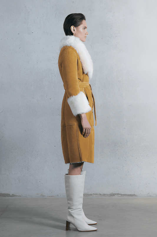 Women's Suede Leather Shearling Coat In Tan Brown