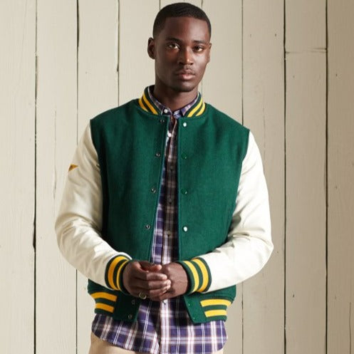 Men's Varsity Letterman Leather Jacket In Green & White Sleeves