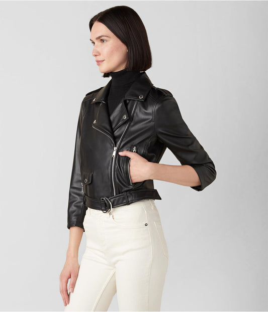 Women's Biker Leather Jacket In Black With 3/4 Sleeves