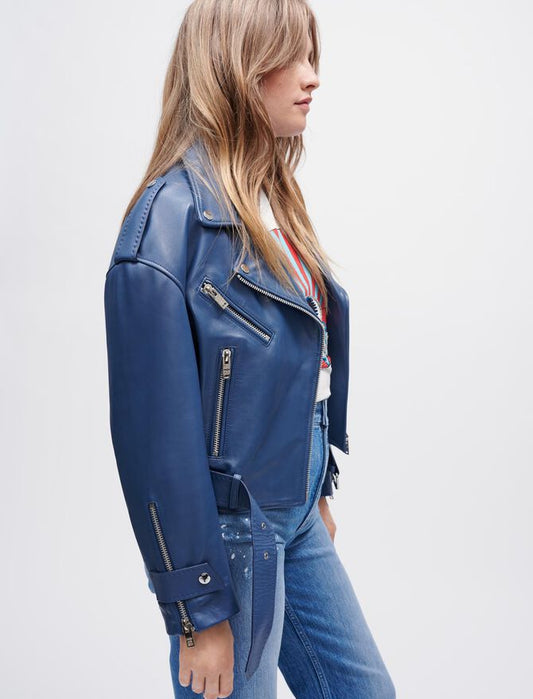 Women's Biker Leather Jacket In Wine Blue With Belt