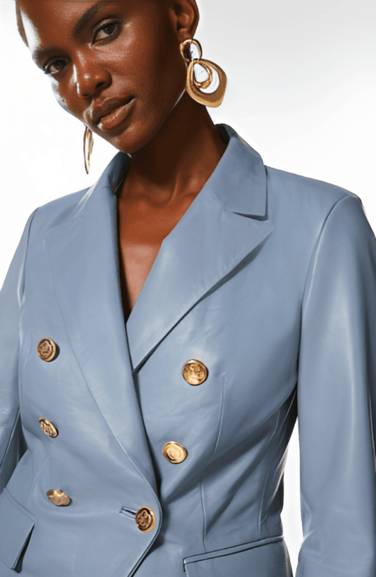 Women's Leather Blazer In Stone Blue With Golden Buttons