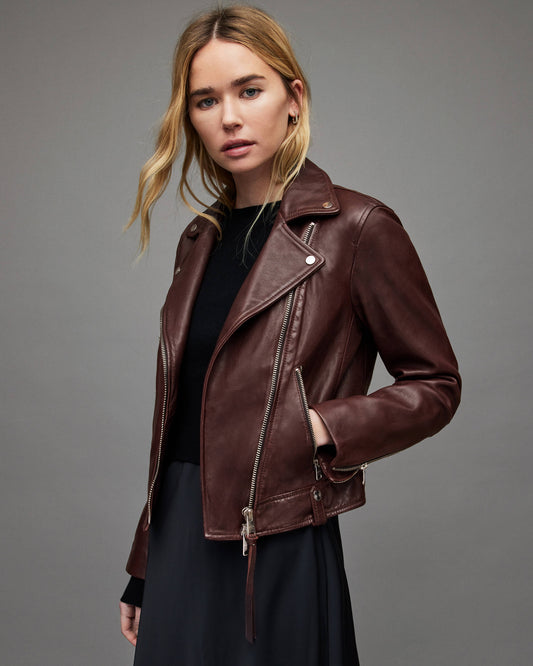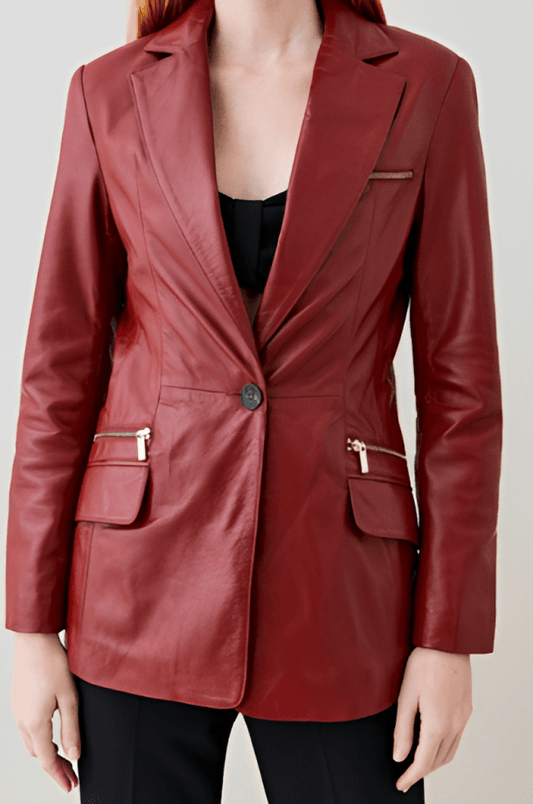 Women's Leather Blazer In Mahogany Red With Golden Buttons