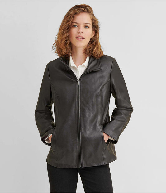 Women's Leather Biker Jacket In Black With Removable Fur Collar