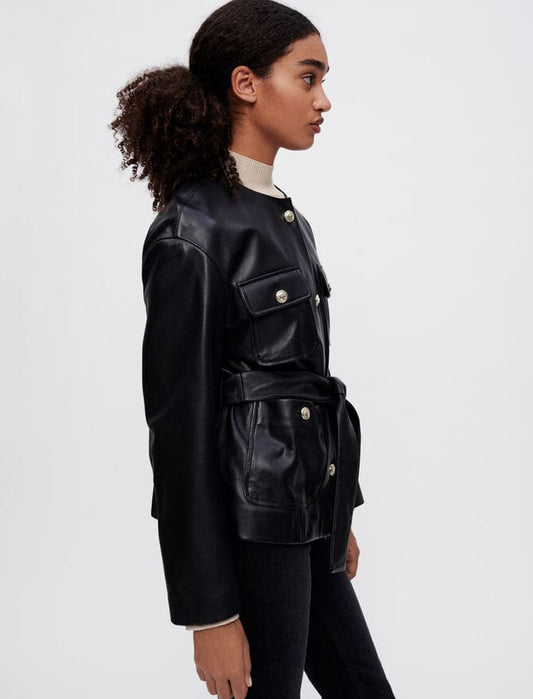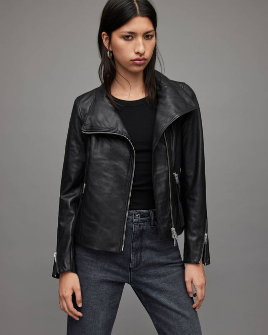 Women's Leather Biker Jacket In Black With Quilted Shoulder
