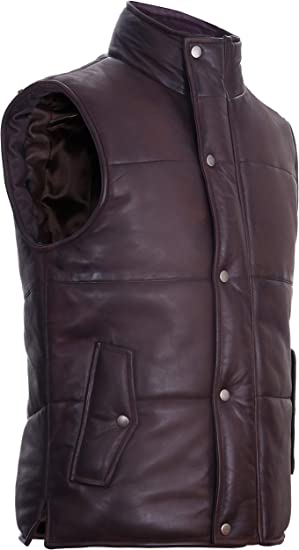 Men's Puffer Leather Vest In Black With Shearling Collar