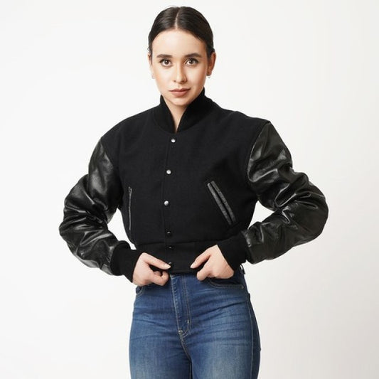 Women's Cropped Varsity Leather Jacket In Black & White Sleeves