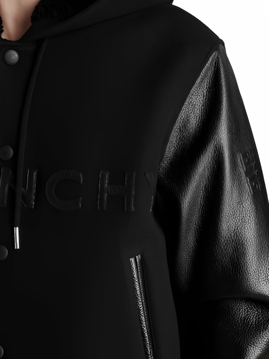 Men's Varsity Bomber Leather Jacket In Black With Hood
