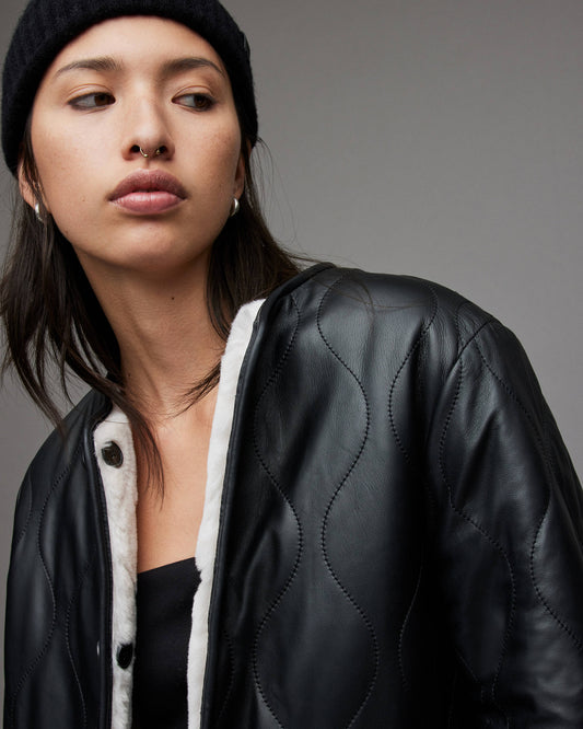 Women's Distressed Shearling Bomber Leather Jacket In White