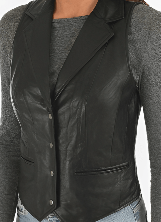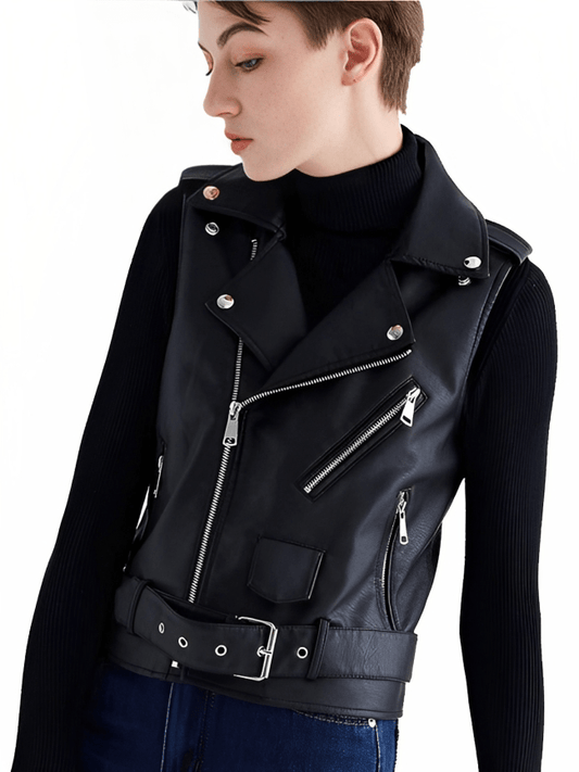 Women's Biker Shearling Leather Vest In Black With Belted Waist
