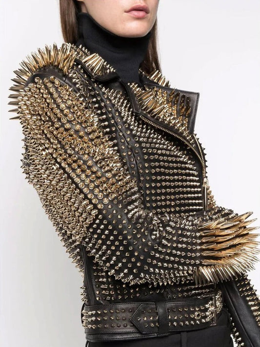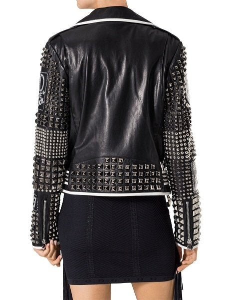 Women's Spiked Biker Studded Leather Jacket In Black