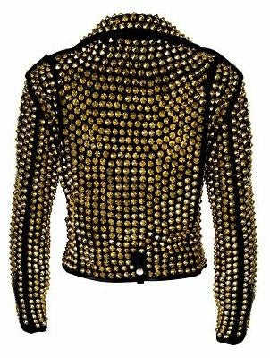 Women's Biker Gold Studded Leather Jacket In Black