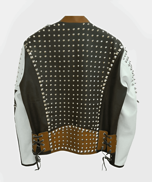 Men's Studded Leather Biker Jacket In Brown & White