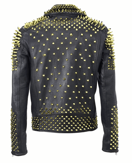 Men's Gold Studded Leather Biker Jacket In Black