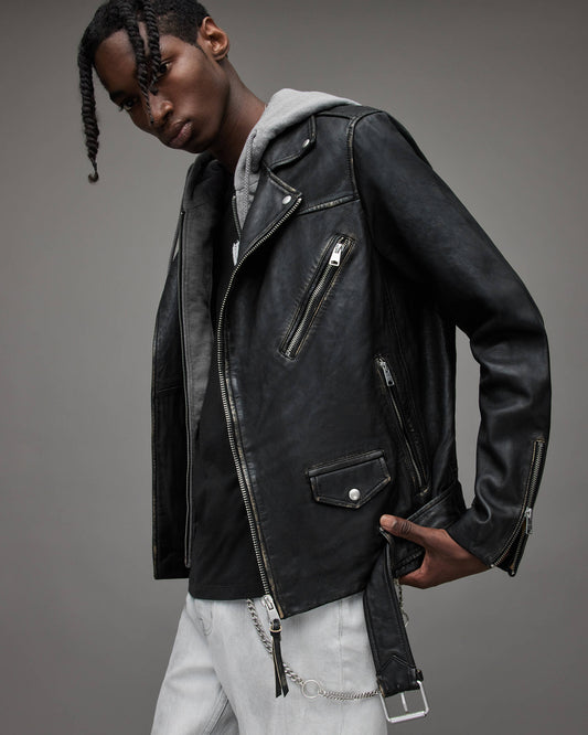 Men's Leather Biker Jacket In Black With Quilted Shoulders
