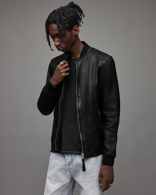 Men's Leather Bomber Jacket In Black With Dual Collar