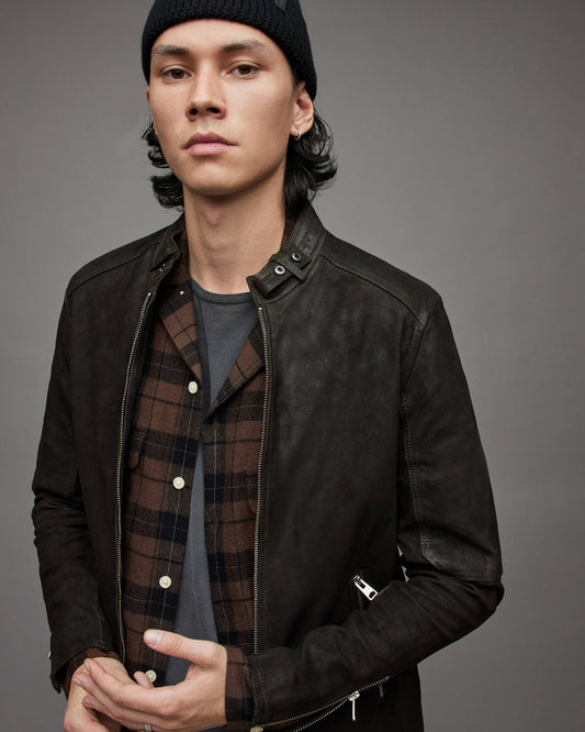 Men's Leather Harrington Jacket In Black With Band Collar And Snap Button