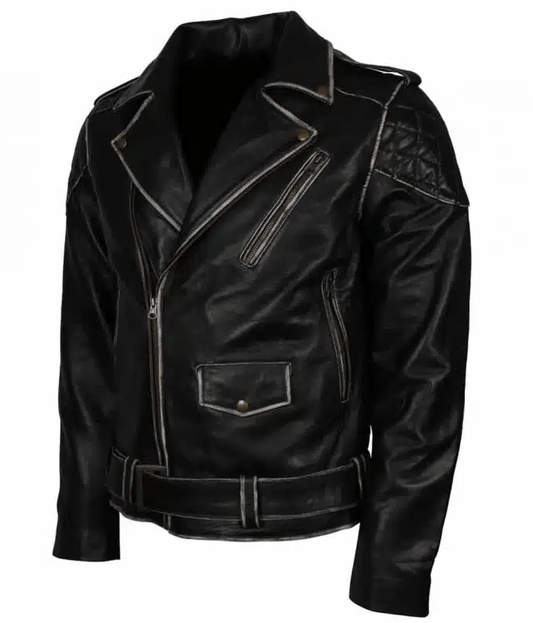 Men's Distressed Leather Vintage Jacket In Black With Belt