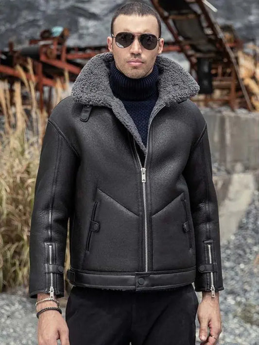 Men's Shearling Aviator Fur Leather Jacket In Matte Black