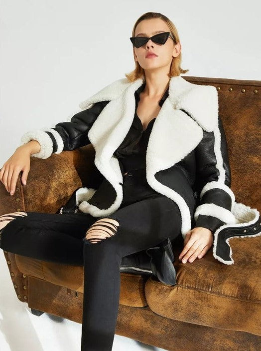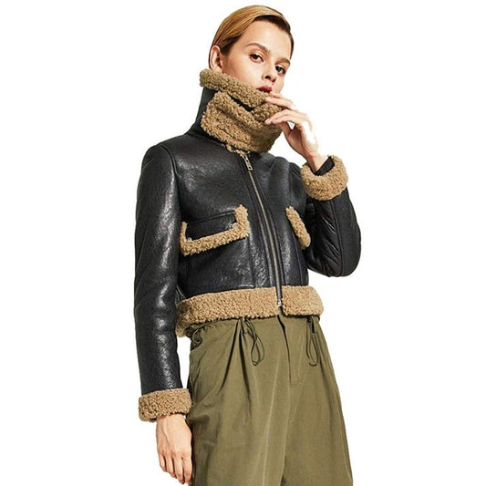 Women's Shearling B3 Leather Jacket In Black With Oversized Collar