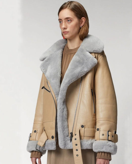 Women's Aviator Sheepskin Fur Leather Jacket In Tan Brown