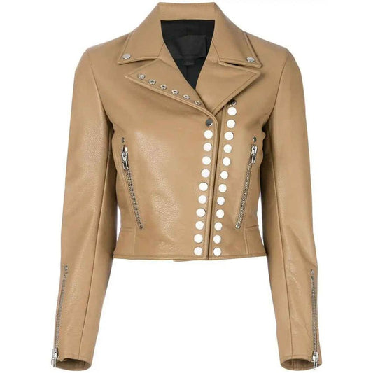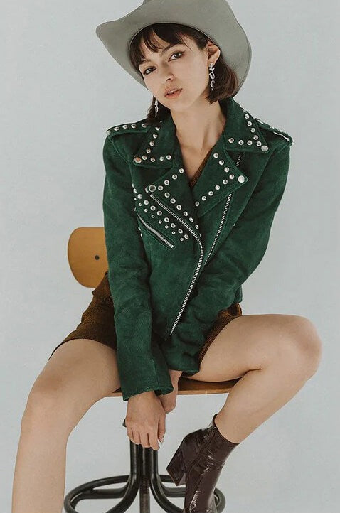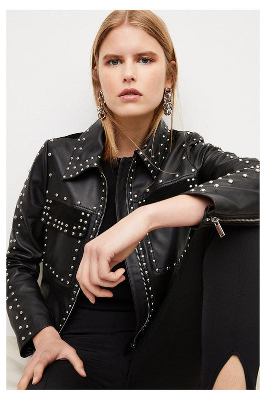 Women's Studded Suede Leather Jacket In Black With Belted Waist