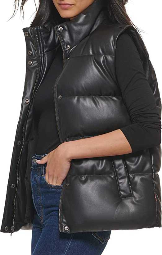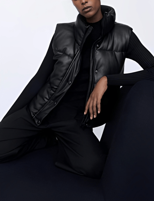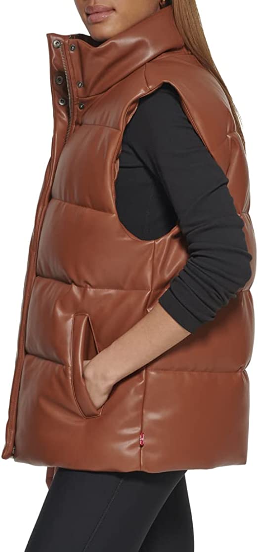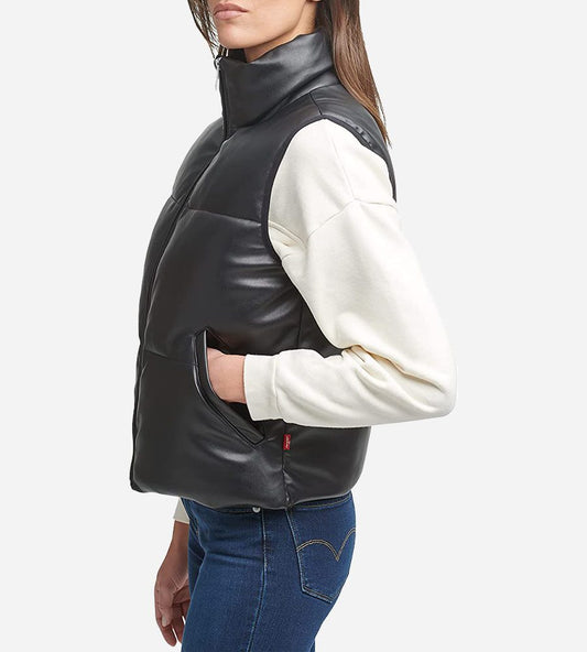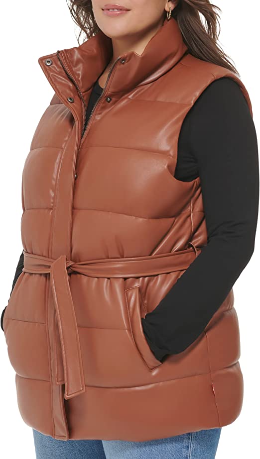 Women's Puffer Leather Vest In Chocolate Brown With Belt