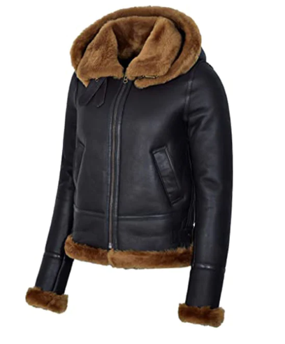 Women's Sheepskin Leather Jacket In Black With Hood