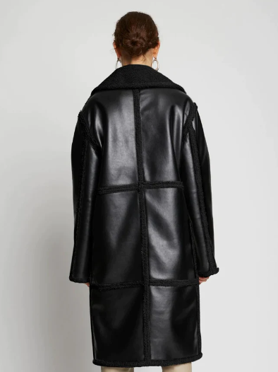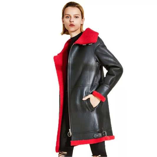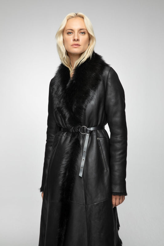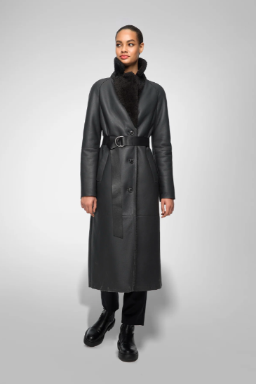 Women's Sheepskin Fur Leather Trench Coat in Black