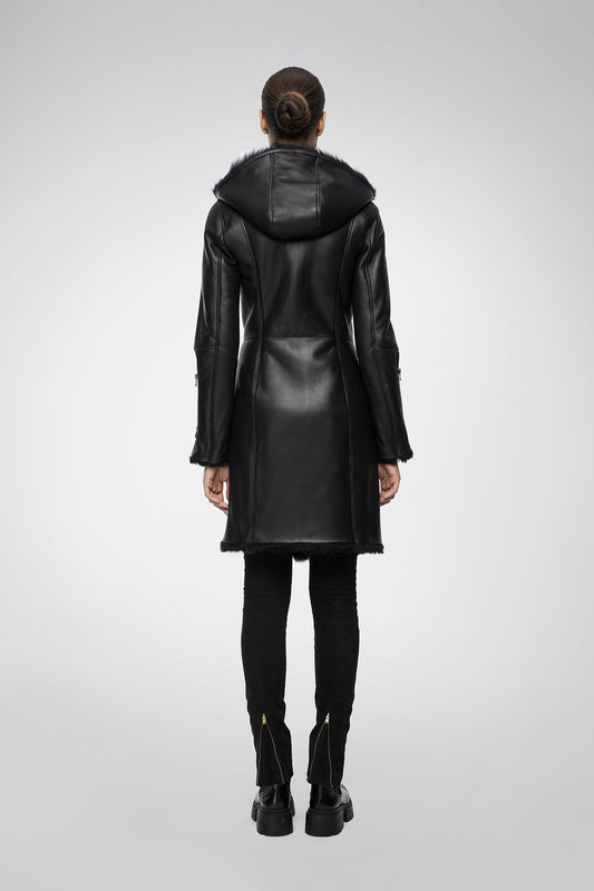 Women's Sheepskin Fur Leather Coat In Black With Hood