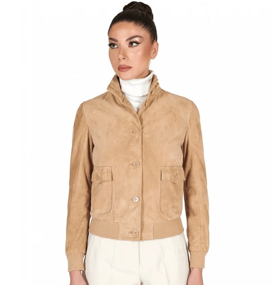 Women's Suede Trucker Leather Bomber Jacket In Tan Brown