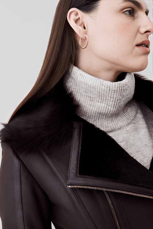Women's Suede Leather Shearling Biker Jacket In Brown