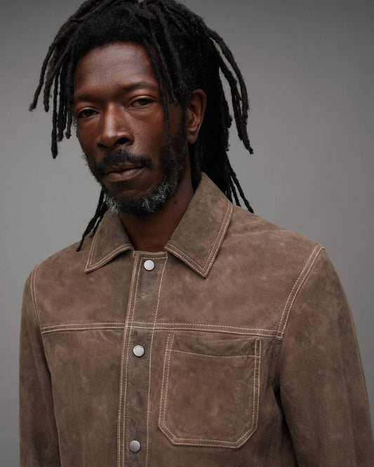 Men's Suede Leather Trucker Jacket In Dark Brown