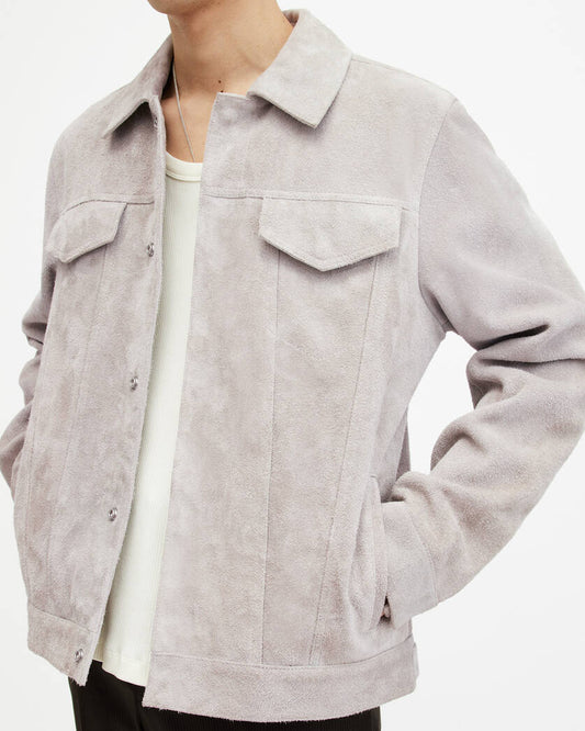 Men's Suede Trucker Leather Jacket In Tan Beige