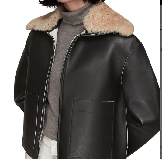 Women's Brown Sheepskin Fur Leather Jacket In Black
