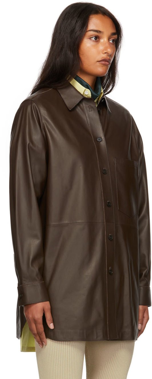 Women's Long Leather Shirt In Coffee Brown
