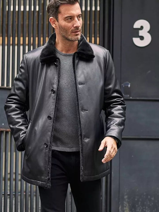 Men's Double Sided Fur Shearling Leather Coat In Black