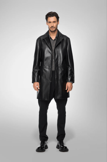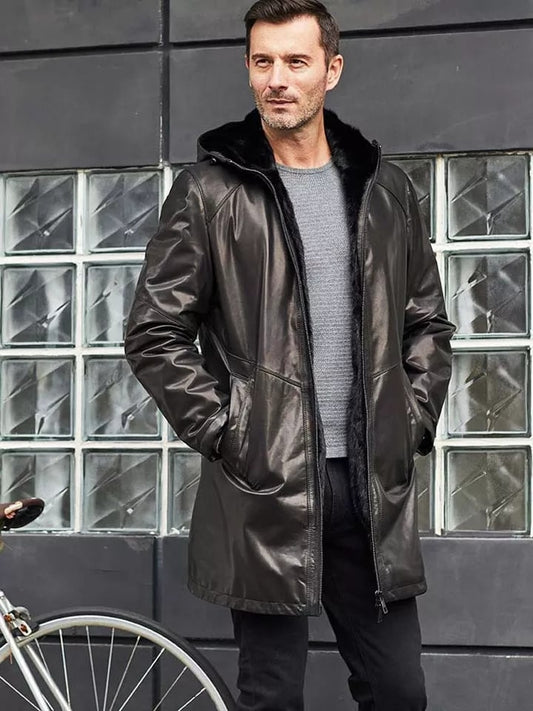 Men's Sheepskin Fur Leather Coat In Black With Hood
