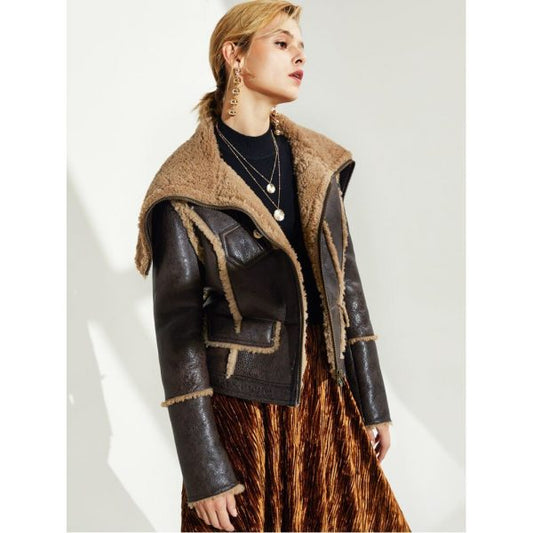 Women's Sheepskin Fur Leather Jacket In Coffee Brown With Oversized Collar