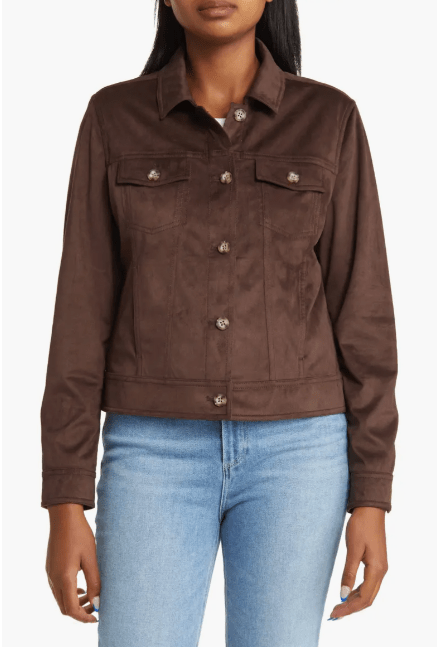 Women's Suede Leather Trucker Jacket In Coffee Brown