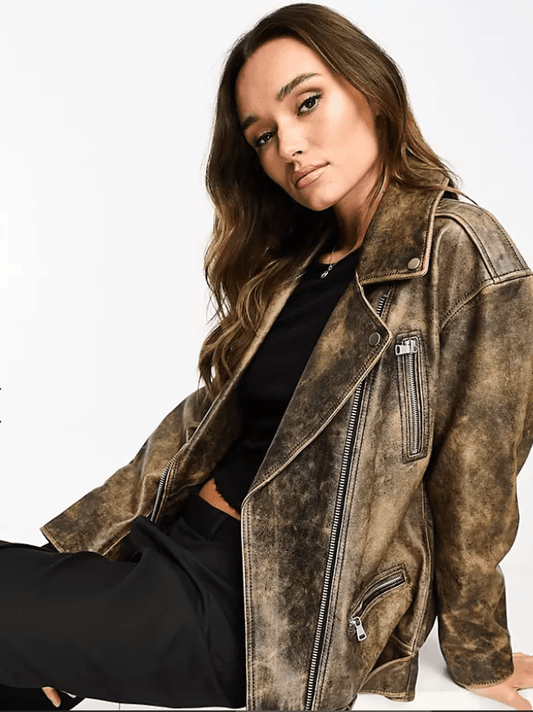 Women's Distressed Biker Leather Jacket With Belt