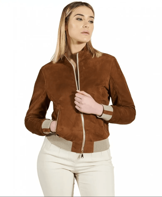 Women's Suede Bomber Leather Jacket In Dark Brown