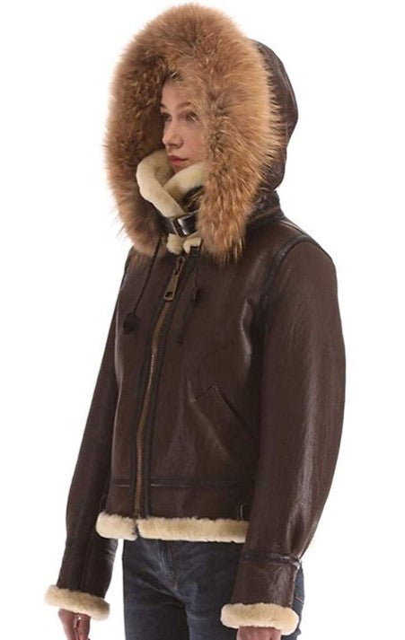 Women's Shearling Leather Jacket In Dark Brown With Removable Hood