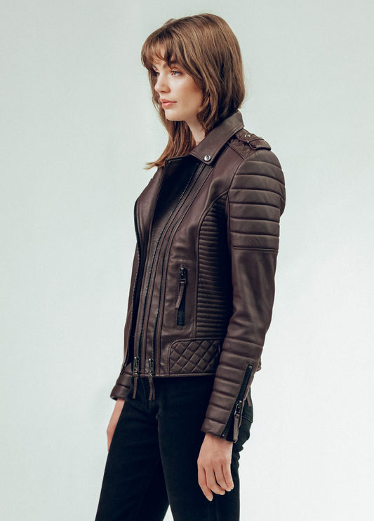 Women's Leather Biker Jacket In Chocolate Brown