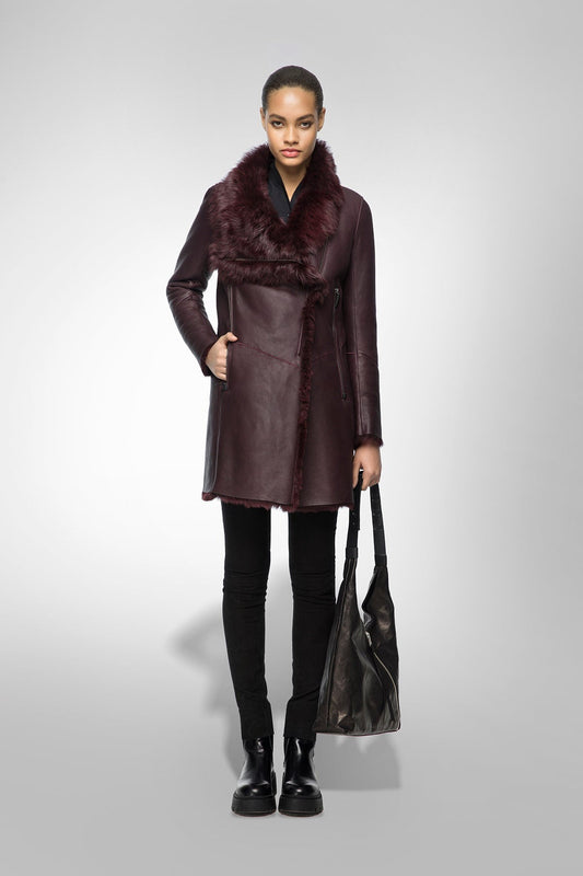 Women's Sheepskin Leather Jacket In Dark Brown With Oversized Collar