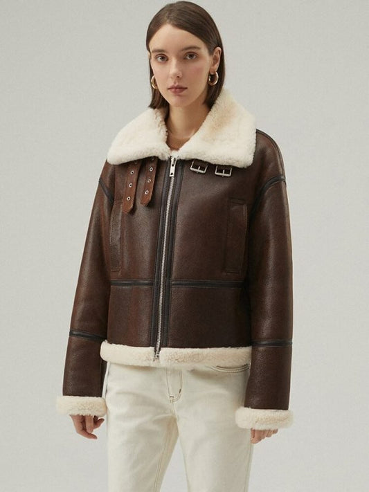 Women's B3 Sheepskin Leather Jacket In Coffee Brown With Strapped Collar